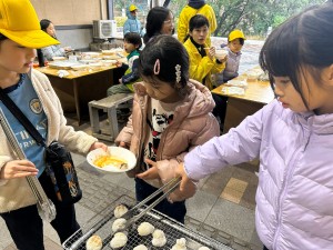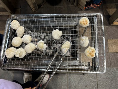 みんなで協力して丸めたお餅を炭火で焼いて、